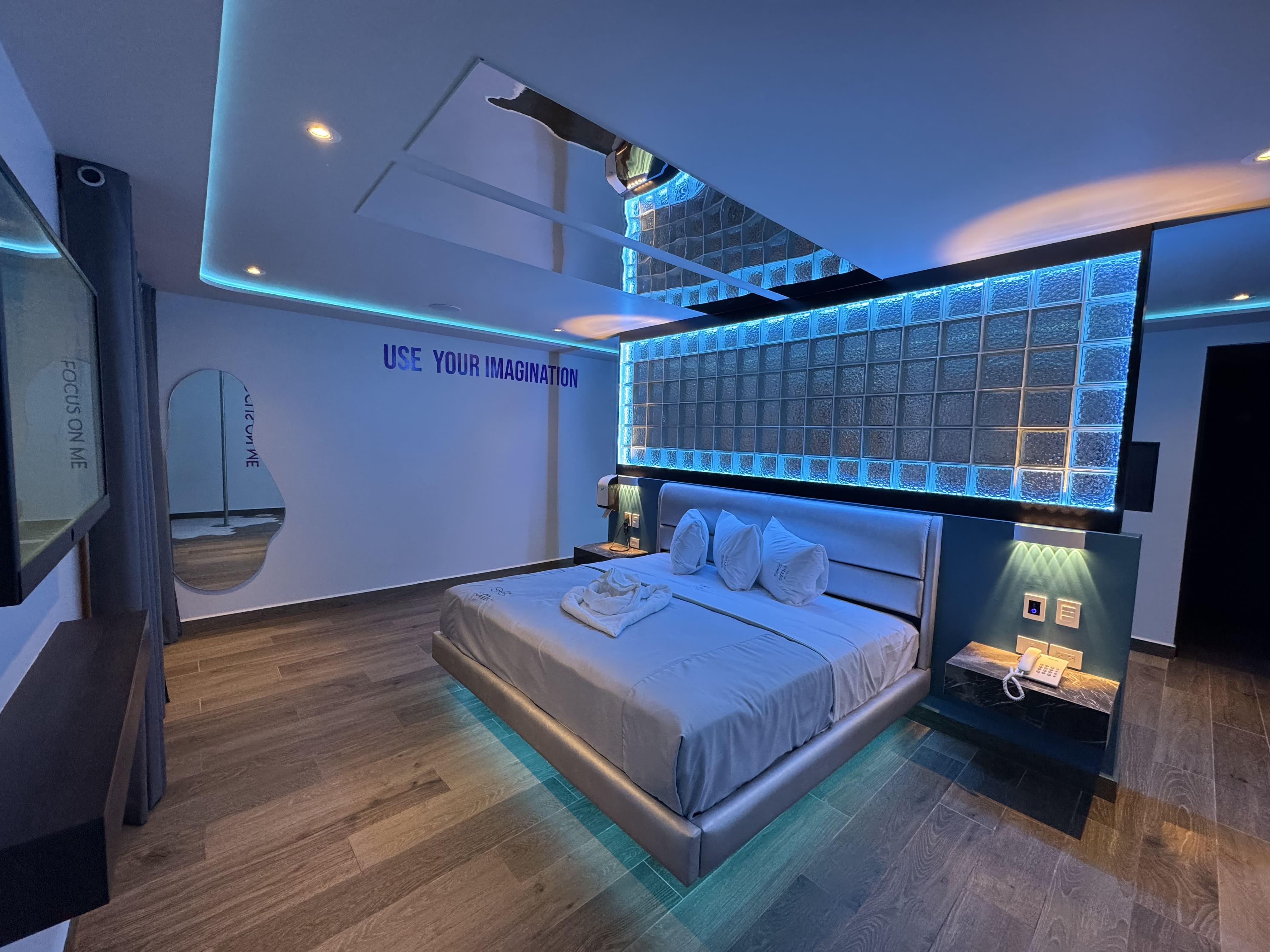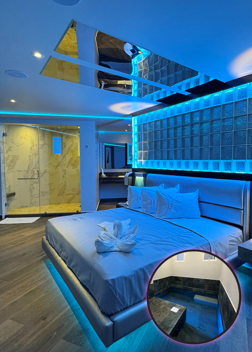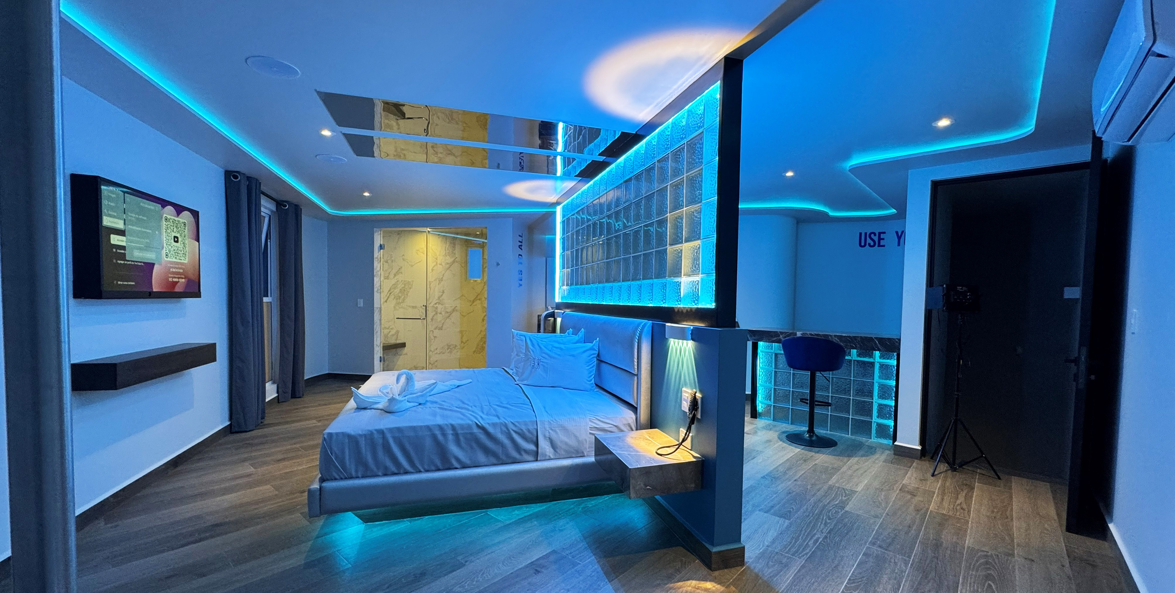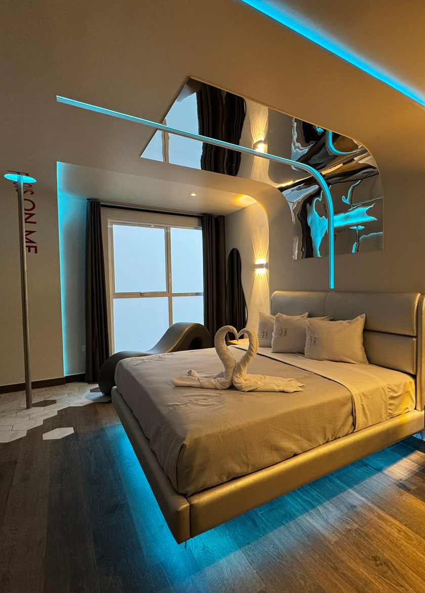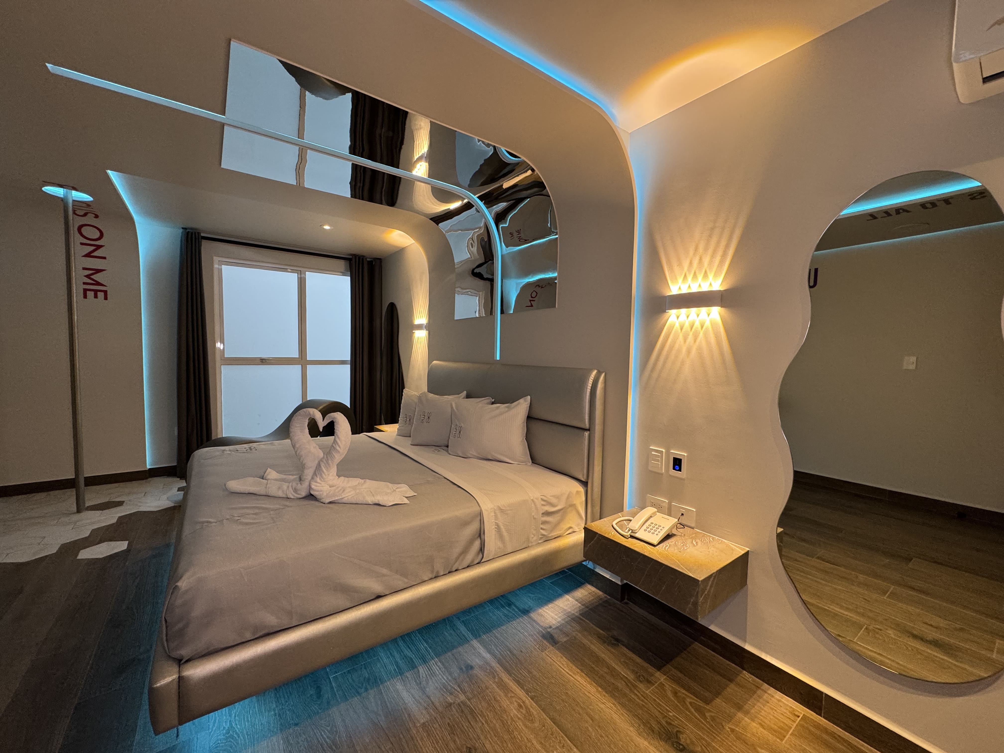 Nuestras suites fusionan confort, seducción y elegancia. Cada suite cuenta con mobiliario de lujo, iluminación ambiental controlada y amenidades eróticas, diseñadas para proporcionar el escenario ideal para una cita de pasión sin limites.
