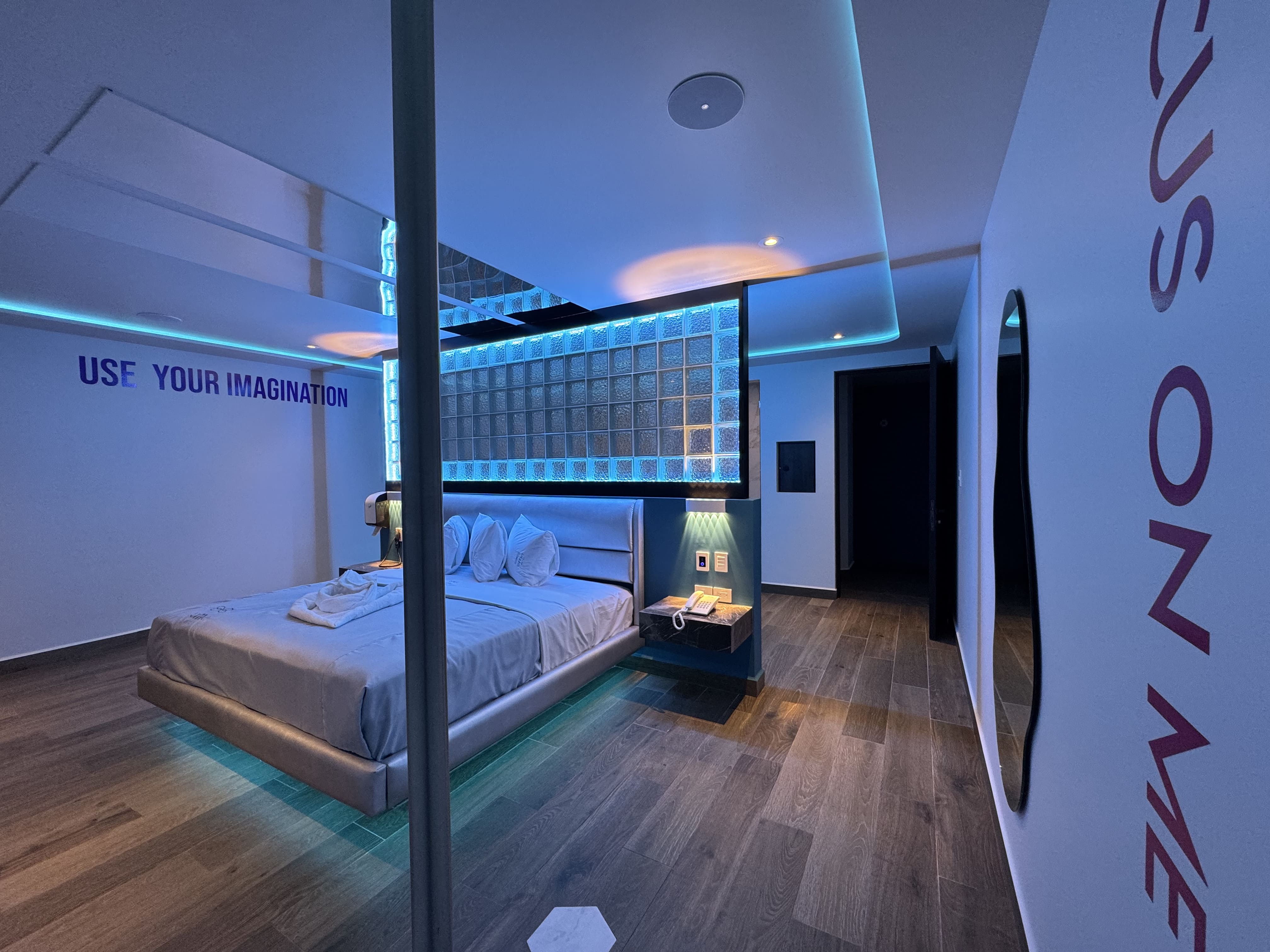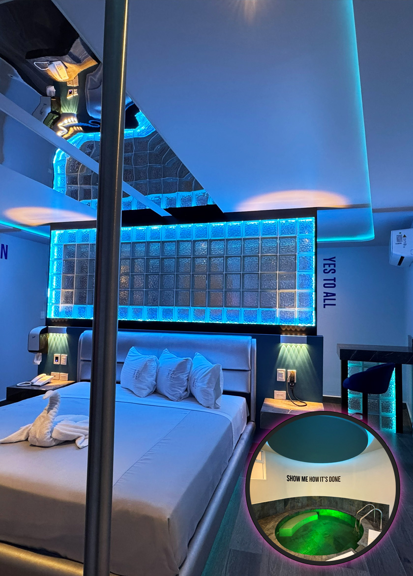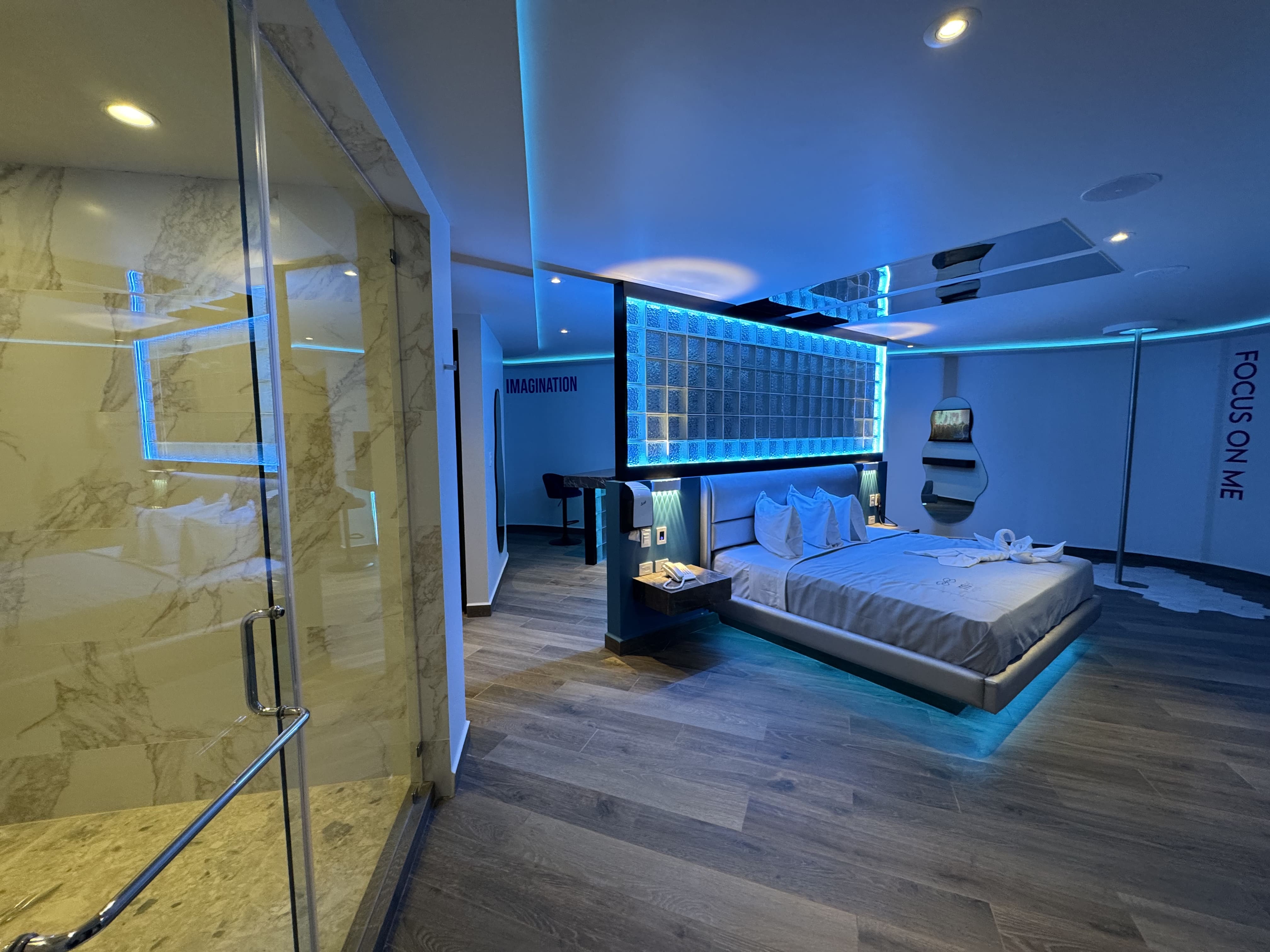 El lugar ideal para dejar volar la imaginación en grupos. La Pool Suite es amplísima y perfecta para convivir entre parejas con total libertad y comodidad. Nos encantó la discreción del servicio y que las instalaciones estuvieran impecables. Las luces y el sistema de sonido crea el ambiente exacto para una noche inolvidable y sin tabúes.