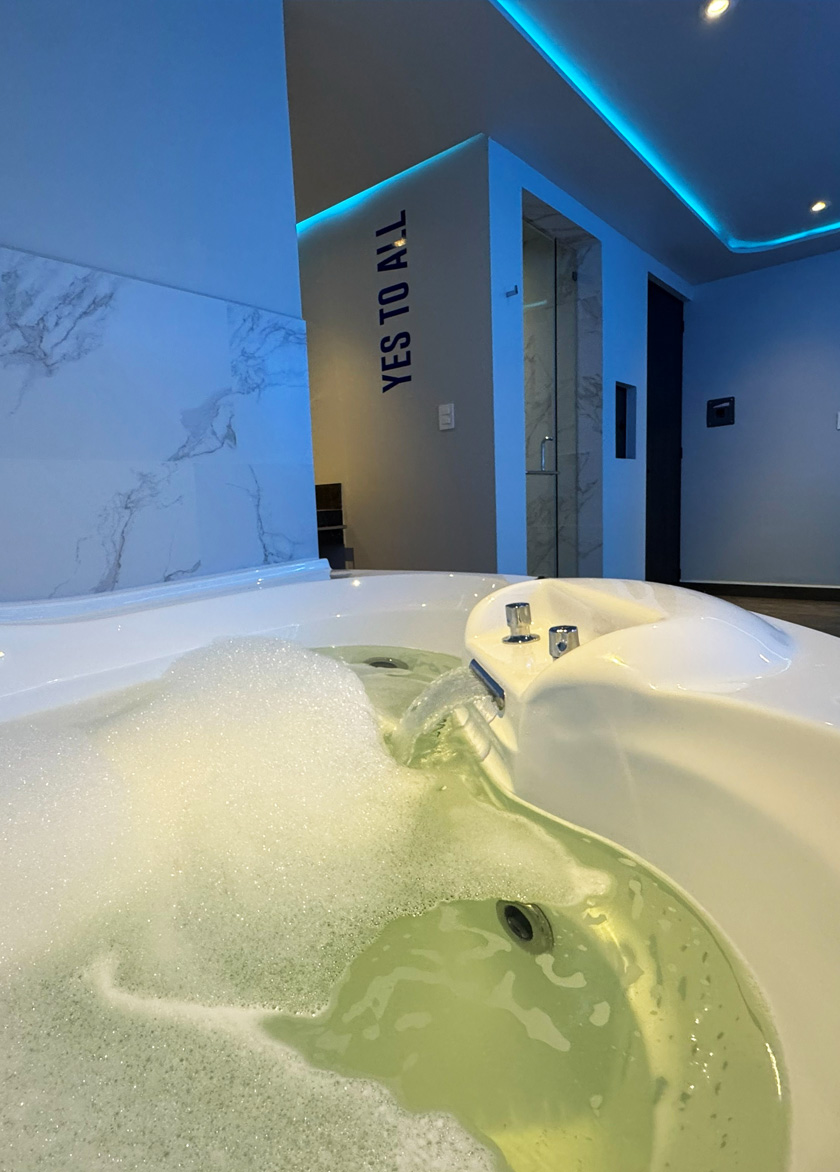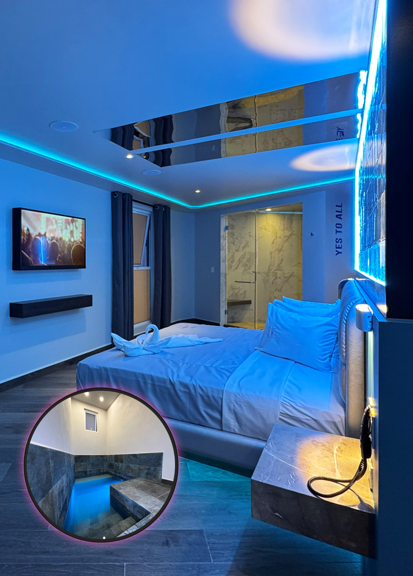 Sumérgete en el placer. Nuestras Master Suites y Pool Suites incluyen albercas privadas climatizadas e hidromasaje, creando el ambiente acuático ideal para relajarse y divertirse. Suites de 2 pisos perfectas para juegos swinger o para grupos que desean dar rienda suelta a la pasión.